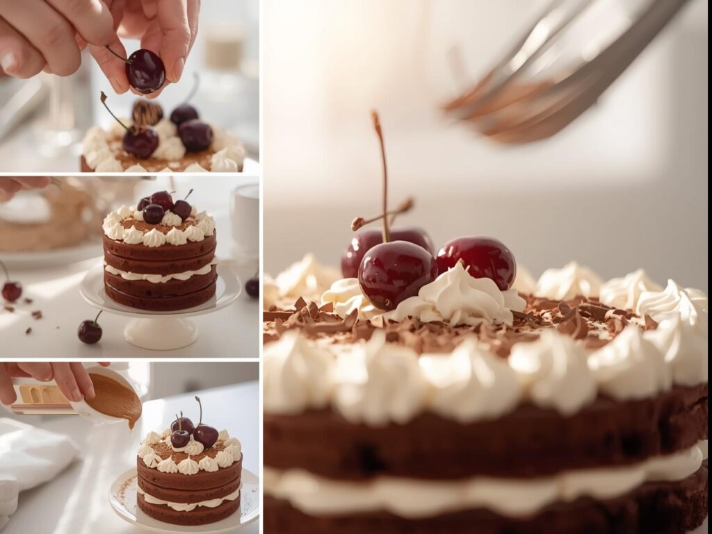 - Frost and Garnish: Use the remaining whipped cream to generously frost the top and sides of the cake. Gently press the chocolate shavings onto the sides and top. Garnish the top with fresh cherries.